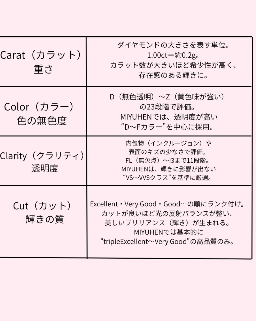 MIYUHENでは D〜Fカラー × VS〜VVSクラス を中心に使用。